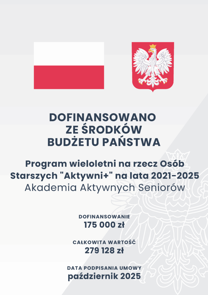 Projekt został dofinansowany ze środków rządowego programu wieloletniego na rzecz Osób Starszych „Aktywni+” na lata 2021-2025. Edycja 2025.